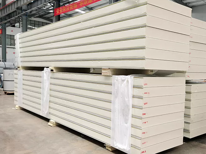 ຄວາມທົນທານແລະຄວາມແຂງແຮງ: ຊັ້ນນອກໂລຫະຂອງແຜ່ນ sandwich PU ສະຫນອງຄວາມທົນທານແລະຄວາມເຂັ້ມແຂງຂອງໂຄງສ້າງ. ພວກມັນຖືກອອກແບບເພື່ອທົນທານຕໍ່ສະພາບອາກາດທີ່ບໍ່ດີ, ເຊັ່ນ: ລົມແຮງ, ຝົນ, ແລະຫິມະ, ຮັບປະກັນຄວາມຫມັ້ນຄົງແລະອາຍຸຍືນຂອງເຮືອນ.